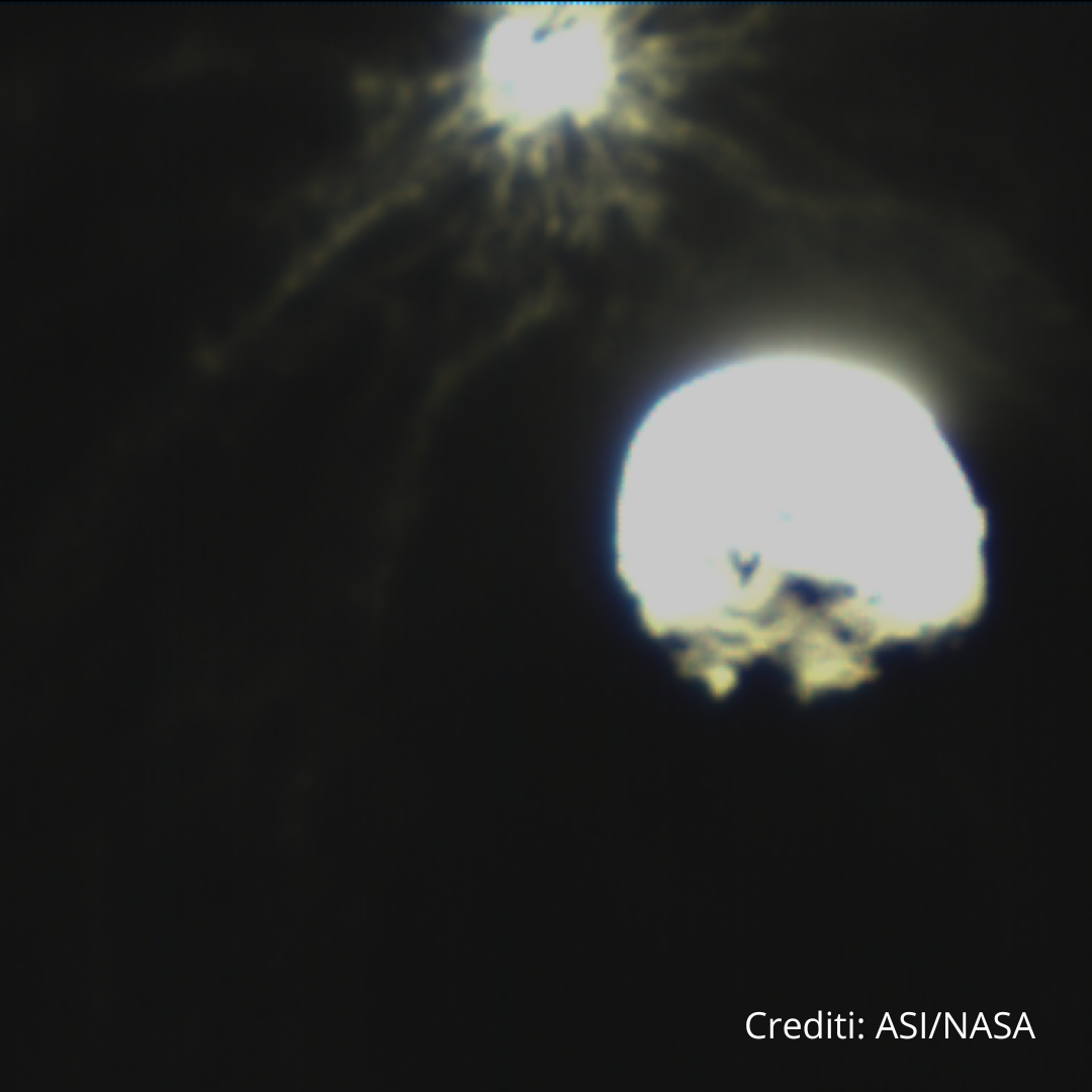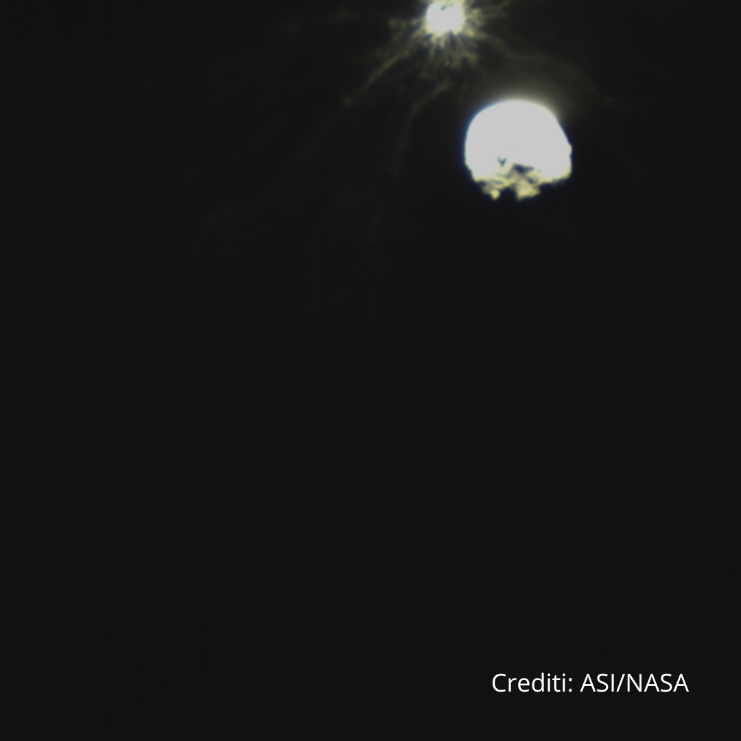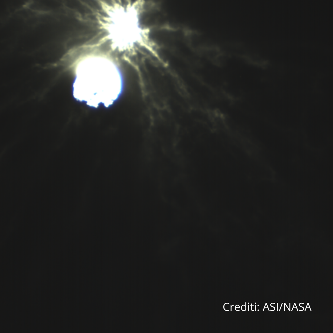 - Immagine LUKE con un ritaglio diverso (già elaborata in RGB) che mostra Didymos-Dimorphos e il pennacchio di materiale espulso (distanza LICIACube-Dimorphos = 56,7 km).