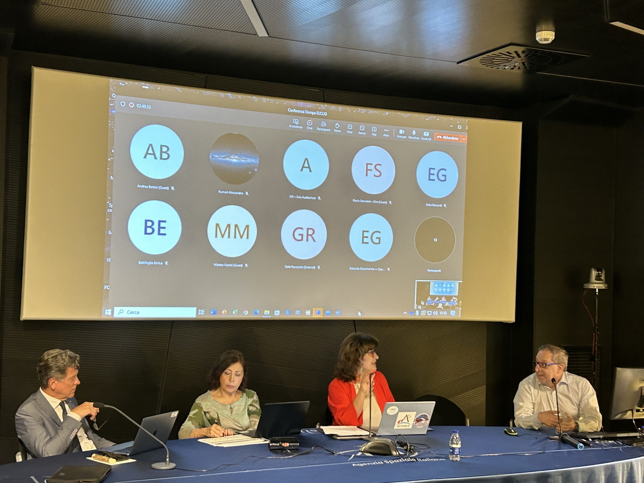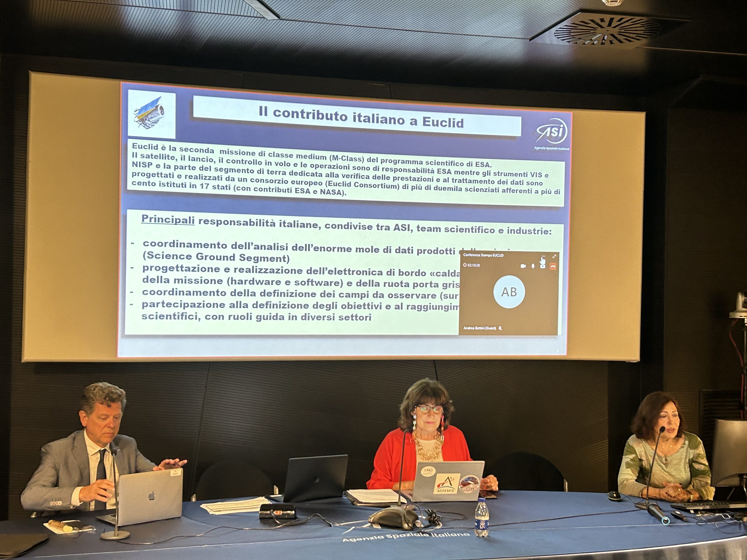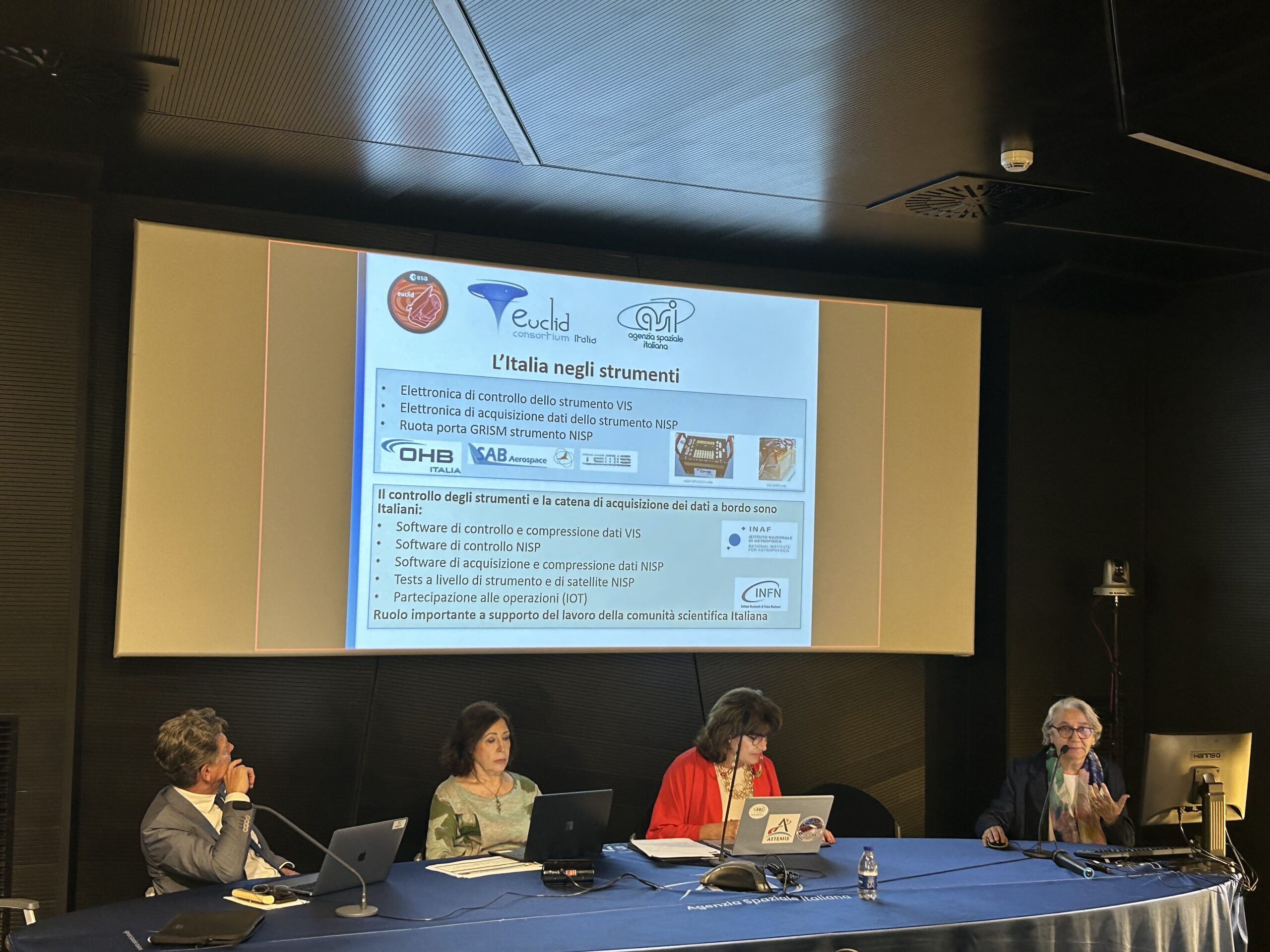 Presenti: Barbara Negri, Responsabile Volo Umano e Sperimentazione Scientifica, ASI, Giuseppe Racca, Project Manager della missione Euclid, ESA, Anna Maria Di Giorgio, Coordinatore tecnico-scientifico dell’accordo ASI-INAF per il supporto alle attività per la missione Euclid, INAF, Luca Stanco, Responsabile Nazionale INFN per Euclid, Walter Cugno, Responsabile Esplorazione e Scienza Thales Alenia Space.