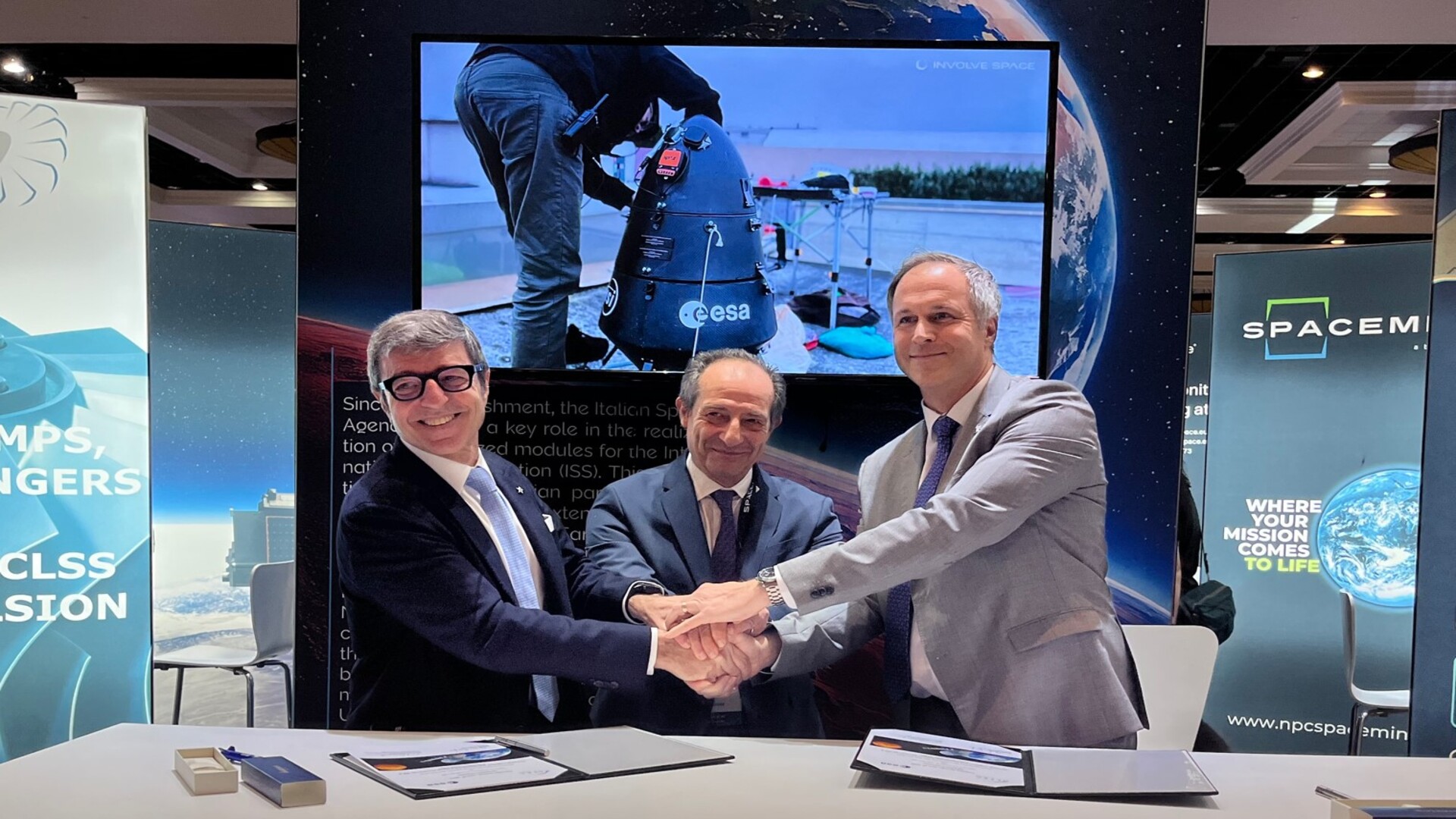 Foto 4: Vincenzo Giorgio, amministratore delegato ALTEC, Mario Cosmo, Direttore Scienza e Innovazione ASI, e Daniel Neuenschwander, Direttore dell'Esplorazione Umana e Robotica ESA. Giorgio e Neuenschwander hanno firmato un contratto tra ALTEC ed ESA relativo a 'Training, Logistics and Operations Support Services for ISS & Exploration 2025-2029'