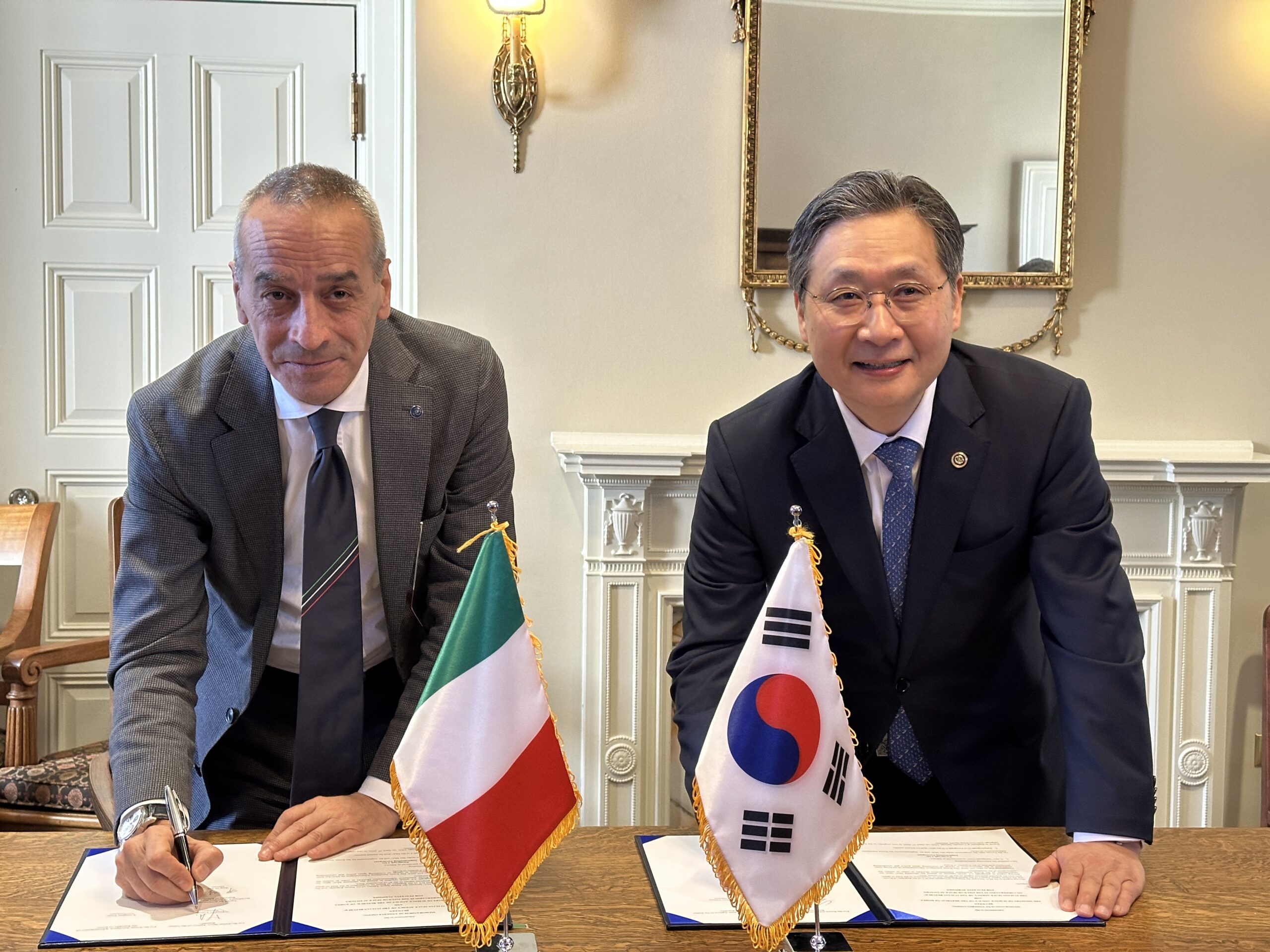 Foto 1: il presidente ASI Teodoro Valente e Yoon Young-bin, presidente e dg Korean Aero Space Administration, hanno firmato il 7 aprile un emendamento al Memorandum of Understanding già esistente, che punta ad ampliare la cooperazione in ambito spaziale tra le due agenzie
