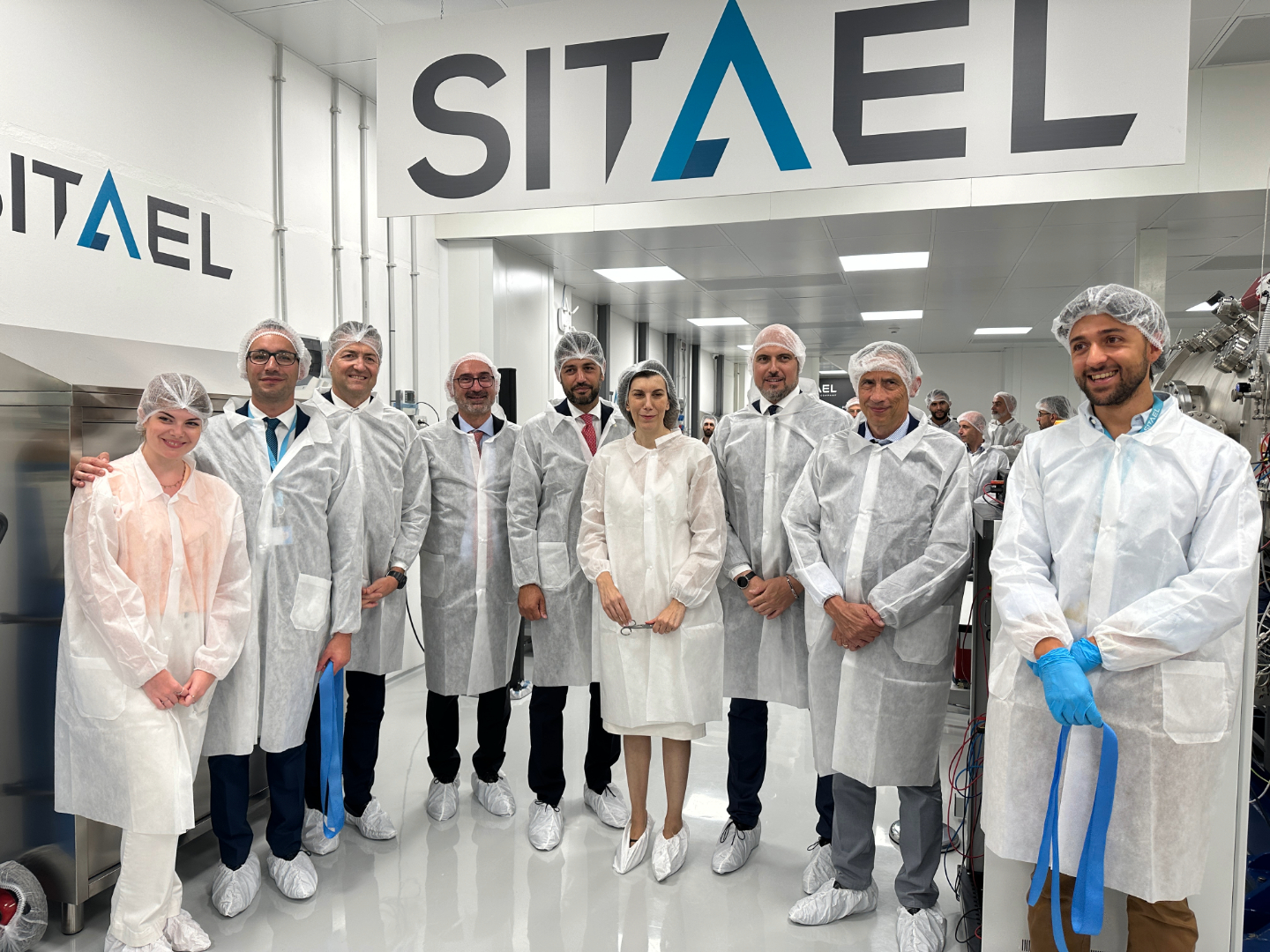 - Il taglio del nastro: Chiara Pertosa, CEO di SITAEL, Marco Molina, Managing Director SITAEL, Stefan Gregucci, Head of propulsion SITAEL, Enrico Cavallini, Responsabile ufficio accesso allo spazio e servizi in orbita di ASI, Tommaso Ghidini, Head of the Mechanical Department di ESA, Andrea Marabotti, Commissione attività produttive Camera, Riccardo Zucchi, Rettore UNIPI