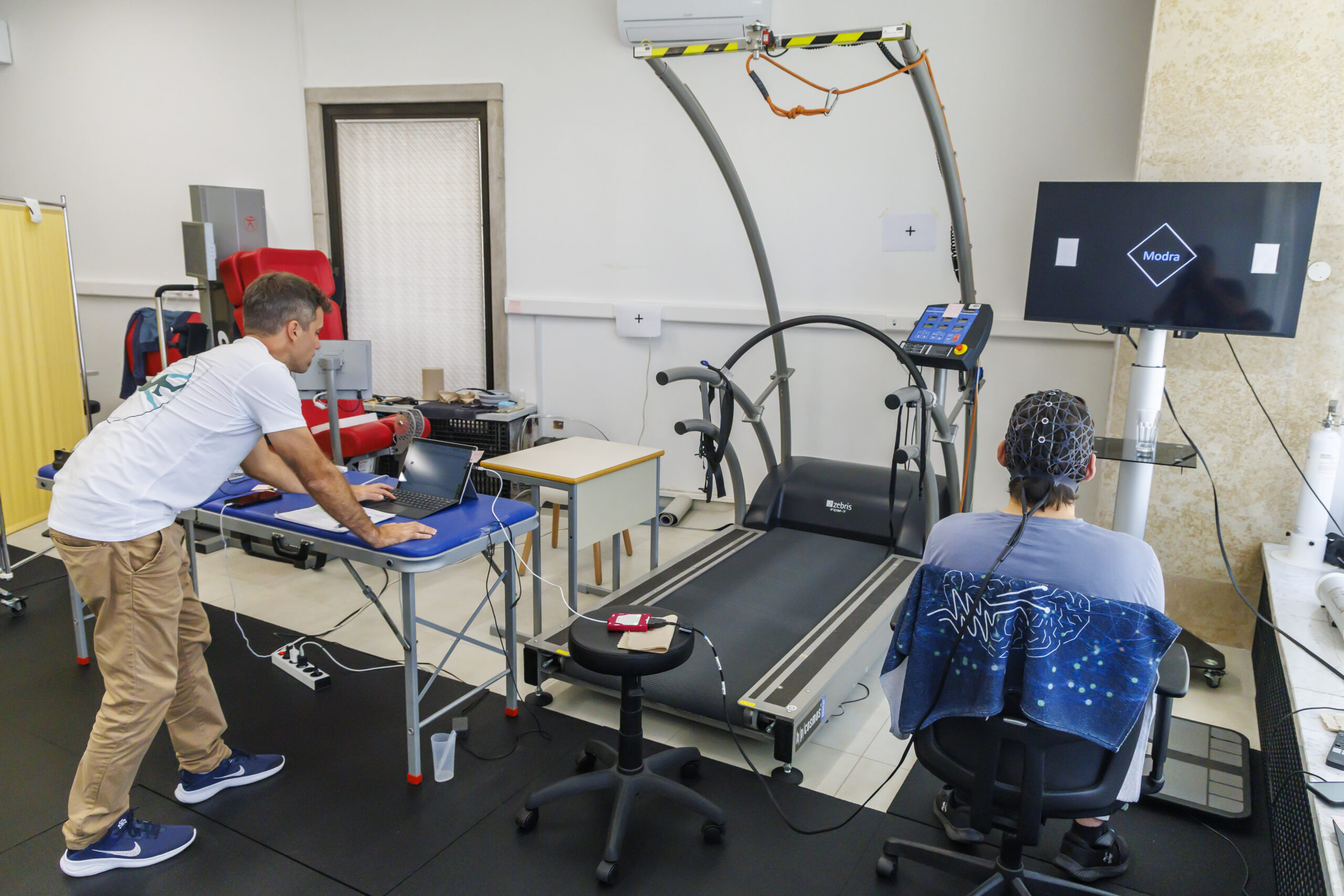 Foto 1: Monitoraggio dell'attività elettrica cerebrale con elettroencefalogramma dinamico durante il movimento.