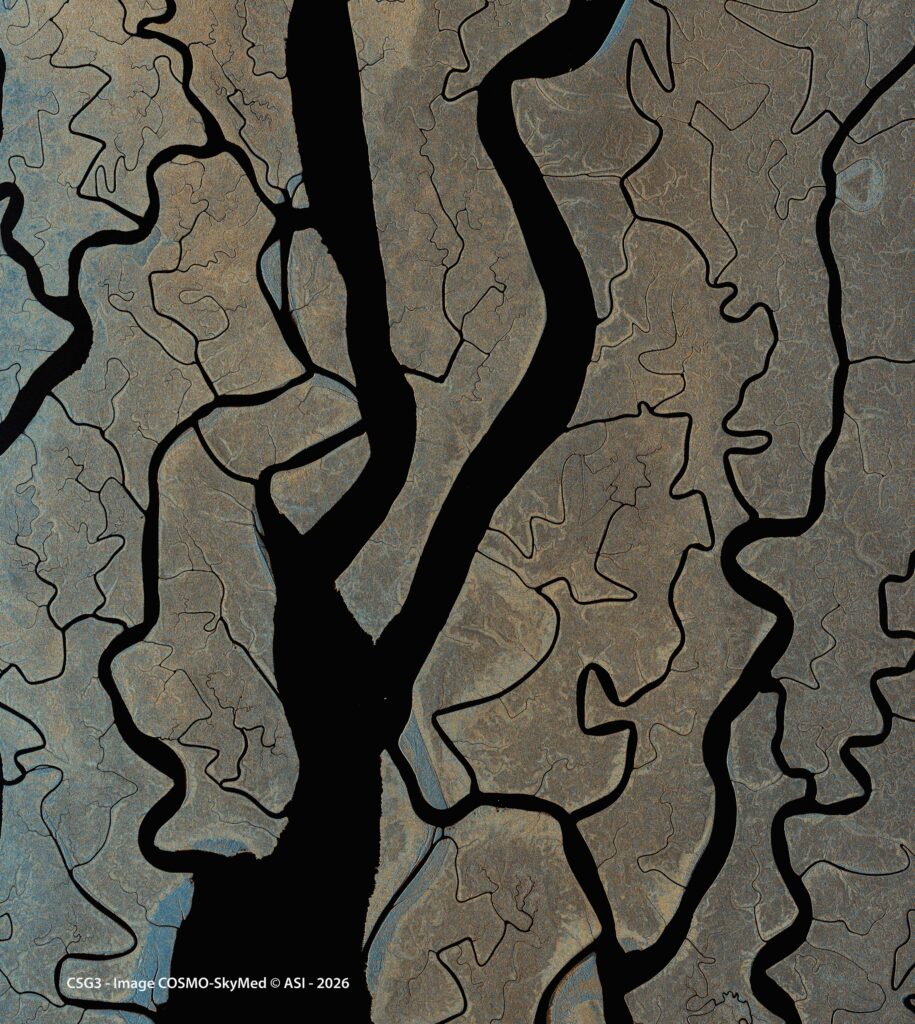 Bangladesh - Un dettaglio del fiume Padma, ramo del fiume Gange, in Bangladesh. L’immagine cattura la variabilità del fiume, i canali mutevoli e i banchi di sabbia che emergono continuamente lungo il suo corso.