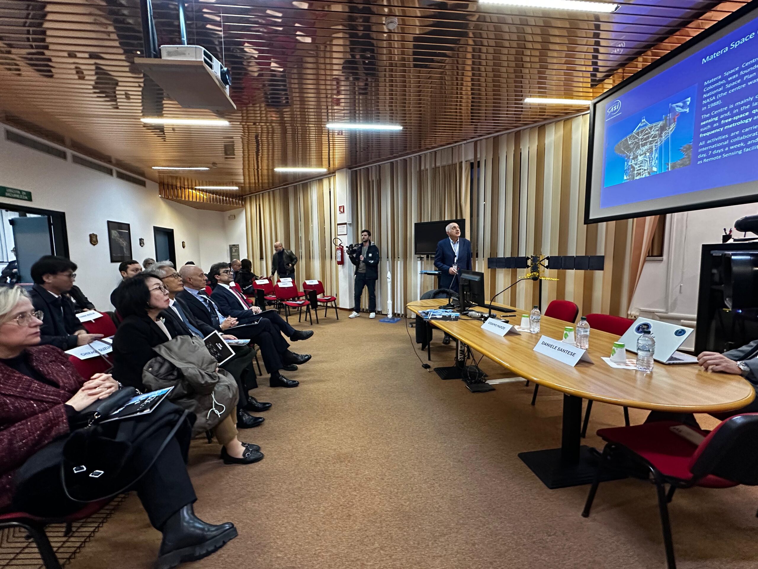 The delegation then visited the e-GEOS (a joint venture between ASI and Telespazio) Space Centre, guided by its director Stefano Micheli, gaining an insight into its core operational activities. At the Matera Remote Sensing Centre, some of the e-GEOS most relevant services were presented, in particular in the domains of maritime surveillance and natural emergency management. The distinctive approach of e-GEOS was highlighted, grounded in the integration of very high-resolution satellite data, innovative algorithms and outstanding expertise, capable of generating concrete and timely solutions to address global challenges. These capabilities were illustrated