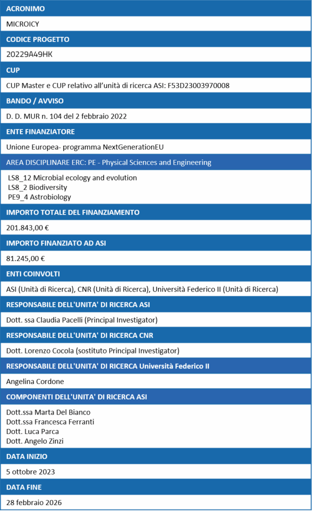 Il progetto MICROICY – Microbes under icy-moon simulation: supporting Solar System exploration, è una collaborazione tra ASI, CNR di Padova e Università di Napoli “Federico II”, e si inserisce nella tematica di ricerca relativa alle scienze della vita applicate allo spazio. Il progetto MICROICY si propone di studiare come i microrganismi estremofili si siano adattati a vivere in sorgenti idrotermali islandesi, quali analoghi di ambienti sottosuperficiali delle lune ghiacciate di Giove e di Saturno. Tale studio è di fondamentale importanza per guidare la ricerca di vite nelle future missioni in esplorazione del nostro Sistema Solare.